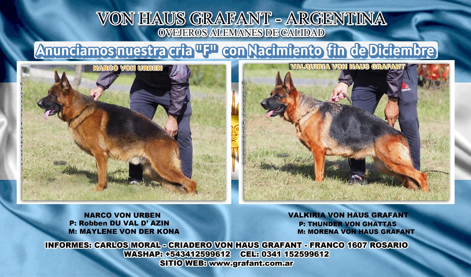 Narco Von Urben, es un excelente macho hijo del perro frances Robben Du Val D'Azin. Narco es un ejemplar muy solido y pedigrí de campeones, aporta a esta unión una línea de sangre de inigualable posibilidades geneticas. Por su parte, Valkiria von Haus Grafant, nuestra perra hija del perro Alemán Thunder von Ghattas, se distingue por su inteligencia, nobleza y la excelente calidad con un pedigree insuperable.